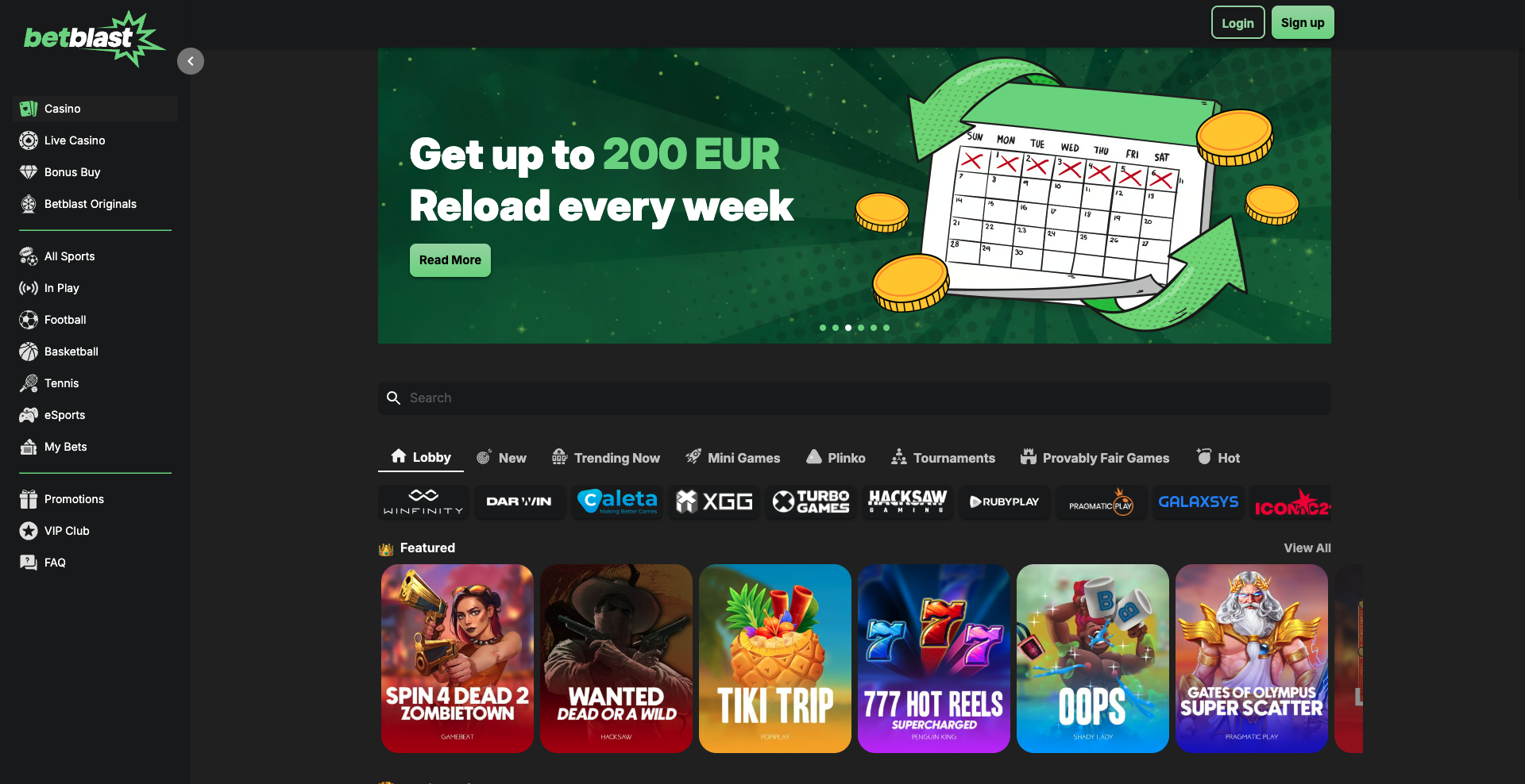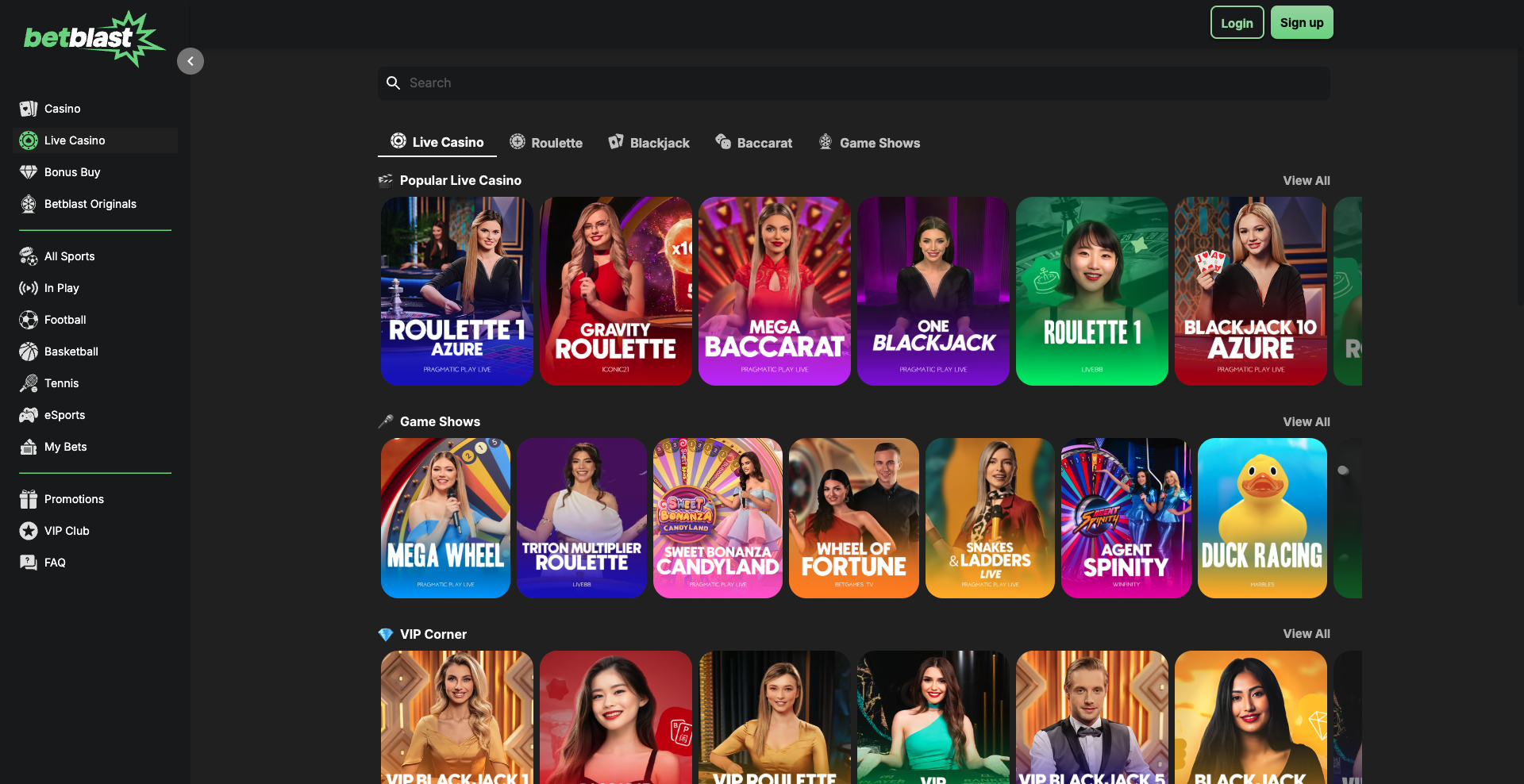 Betblast offers a wide selection of crypto games, there’s something for every type of player. You can find thousands of high-quality Slots, Betblast Classics, Bonus Buys, Jackpot Games, Megaways, Game Shows, and Live Dealers.